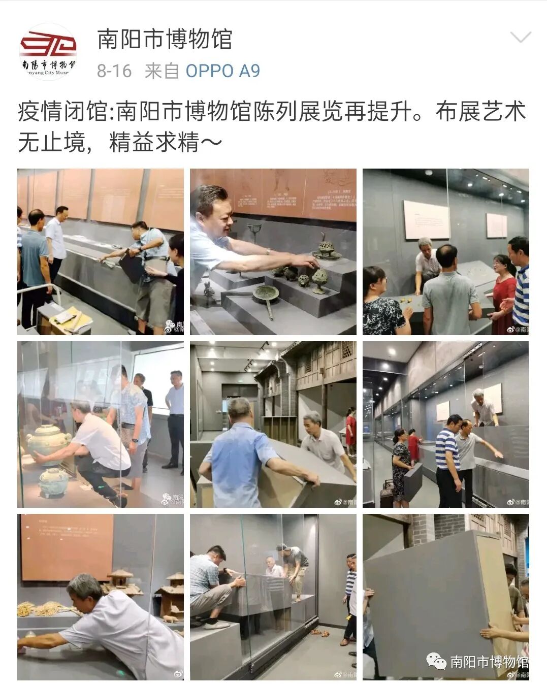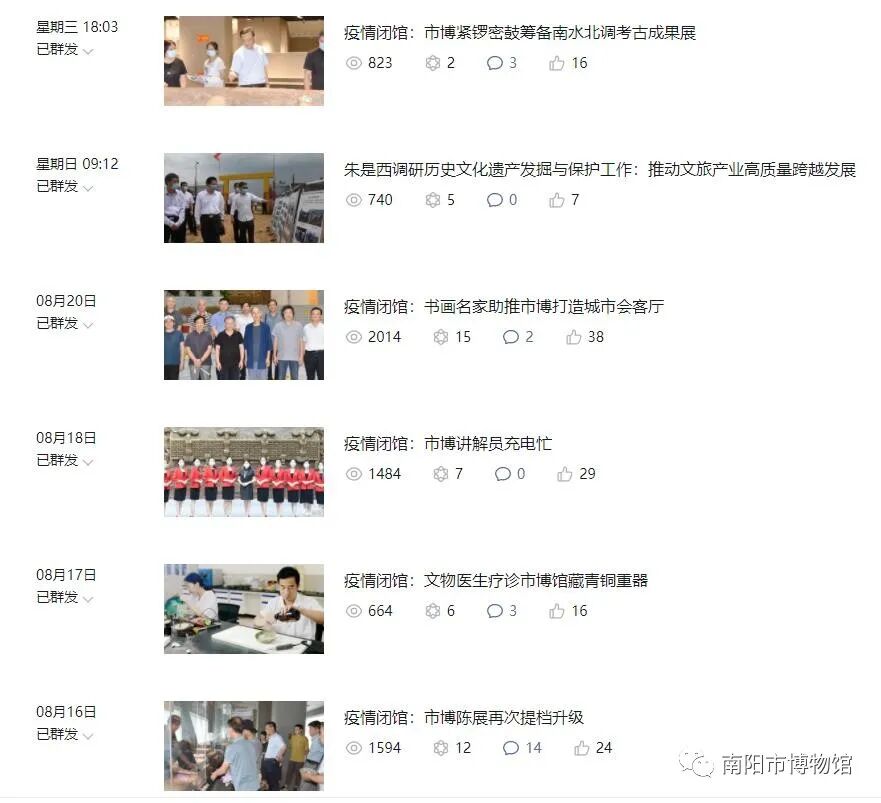 疫情期间,市博利用官方网站、微信号、微博等宣传平台,先后撰写报道了《市博陈展再次提档升级》《文物医生疗诊市博馆藏青铜重器》《市博讲解员充电忙》《书画名家助推市博打造城市会客厅》《市博紧锣密鼓筹备南水北调考古成果展》等新闻,《南阳日报》《南阳晚报》《南都晨报》及新浪网、搜狐网、华人头条等纷纷转载,进一步提高了市博的知名度和影响力。