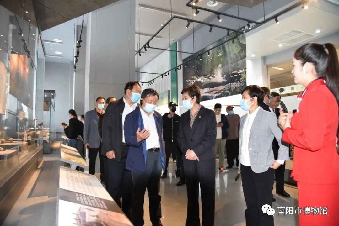 河南省文物局党组成员、副局长贾连敏,河南省文物局文物保护与考古处处长张慧明,河南省文化和旅游厅办公室副主任王凯、河南省文物考古研究院院长刘海旺、副院长梁法伟、史前研究室副主任赵青坡,时任南阳市文广旅局党组书记、局长郑文明,南阳市文广旅局党组成员、副局长赫玉建,南阳市文广旅局党组成员、市博党支部书记、馆长王晓杰等陪同。